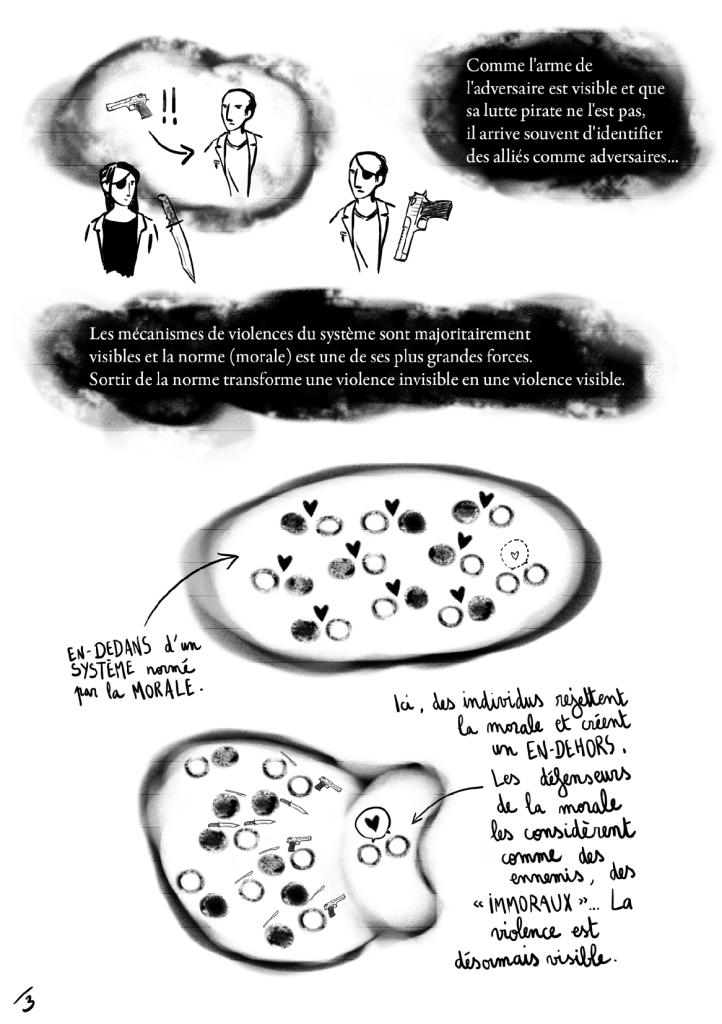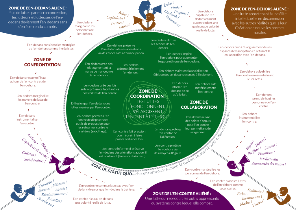 – L’en-contre, enfin, c’est mener une lutte en opposition aux institutions relais de l’oppression (ZAD, Black Blocks, Malcom X, etc.) ; ceci avec l’objectif de contrer activement la domination oppressive, parfois pour protéger les luttes d’en-dehors, parfois pour transformer les institutions oppressives.