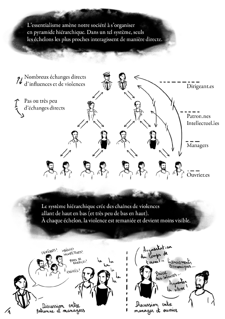 Nous sommes en lutte. Pour nous, cela signifie se sentir minoritaires face à un pouvoir dominant. Nos luttes sont plurielles, nombreuses et intersectionnelles ; visibles ou invisibles. Notre ennemi principal est l’essentialisme, qui considère les caractéristiques d’un être comme innées, et donc possédant une essence propre et immuable. Il s’oppose au déterminisme, selon lequel les êtres construisent et acquièrent leurs propres caractéristiques en fonction de multiples déterminations internes ou externes. Par exemple, l’essentialisme considérera une personne commettant un acte violent comme une personne violente par nature, par « essence » — dont la violence est inséparable d’elle-même. À l’inverse, le déterminisme considérera que les actes violents ont été déterminés par toute une série de facteurs (déterminations) qui amènent la personne à acquérir ces comportements violents. L’essentialisme a comme conséquence directe la hiérarchisation, dont les corollaires sont le racisme, le patriarcat, l’âgisme, le spécisme, le classisme, le validisme, etc.