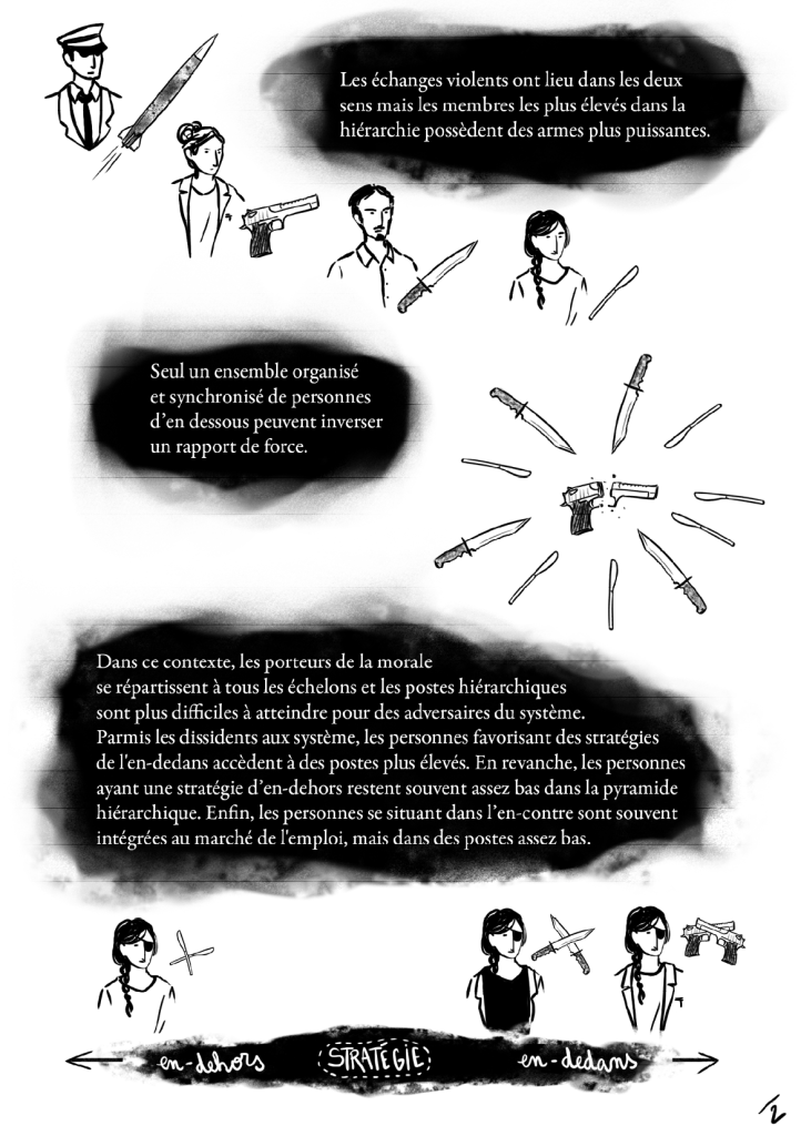 – L’en-dedans permet d’atteindre un public large et souvent confronté aux oppressions du système. En se situant directement dans les instances de pouvoir du système, il permet une transformation directe des normes via ses agents déviants — lorsqu’ils sont capables de relayer les luttes de l’en-dehors et de l’en-contre. Cette condition est strictement nécessaire pour que le système se transforme en concordance avec les luttes menées par les 3 angles stratégiques. Aussi, la marge de manœuvre de l’individu est extrêmement réduite, d’autant plus qu’au cœur du système, l’environnement façonne à ses normes la personne en lutte. Cette dernière risque donc de les intérioriser, de les invisibiliser et donc, d’en relayer les codes oppressants au-delà de sa volonté.