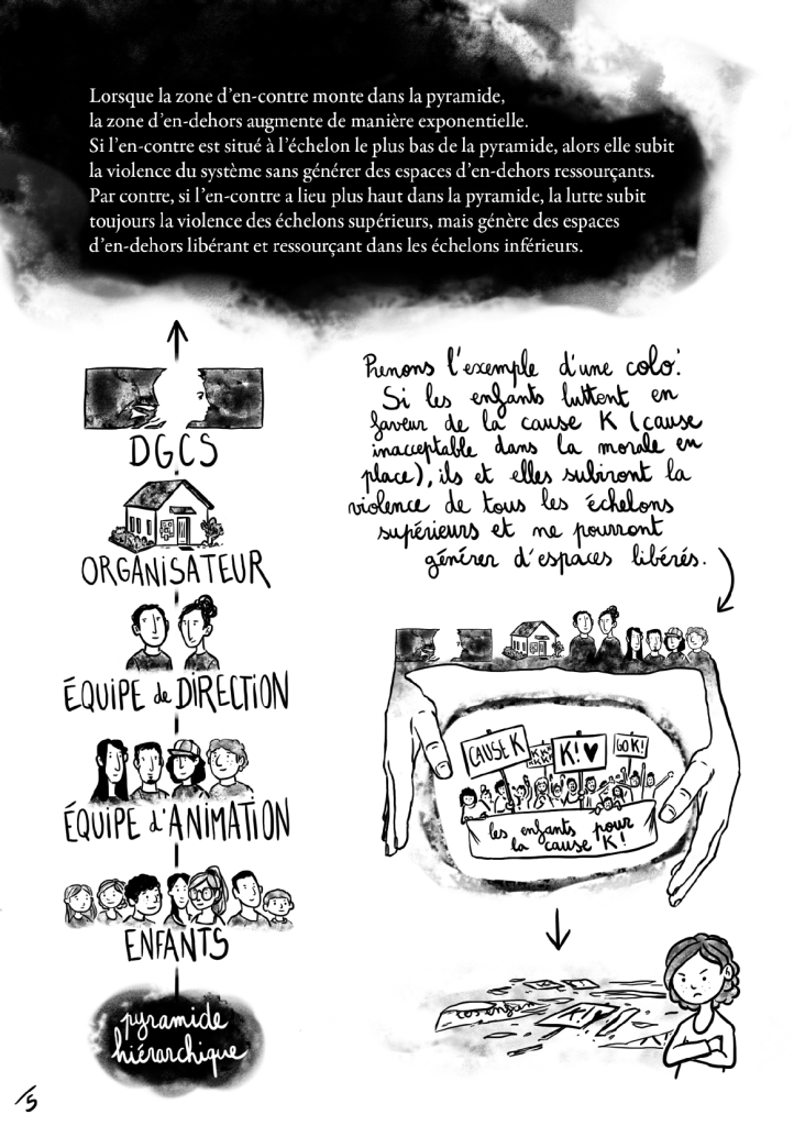 La coordination de ces différents angles a compliqué énormément les positions au sein de l’équipe. Ainsi, ce fut impossible de déhiérarchiser complètement l’équipe tout en essayant de la protéger par l’en-contre. En effet, le meilleur moyen de protéger des adultes expérimentant le cadre généré par l’en-dehors proposé est de ne pas leur laisser accéder aux luttes d’en-contre liées aux échanges avec l’organisateur. Nous n’aurions pas eu ce problème si nous avions rassemblé une équipe d’adultes ayant déjà tous expérimenté un cadre tel que nous le proposions. Ici, nous avons jugé impératif de protéger les personnes expérimentant pour la première fois ce genre de lutte, car l’anti-âgisme demande une profonde remise en question de sa position d’adulte. La mise en place d’un cadre sans autoritarisme fasciste nécessite certes de se requestionner, mais également de transformer sa manière d’être. Nous avons pensé qu’une exposition à ces pressions supplémentaires aurait pu pousser ces animatrices à faire marche arrière, et donc à ne plus garantir une de nos volontés fondamentales : créer un espace d’en-dehors pour les enfants accueillis.