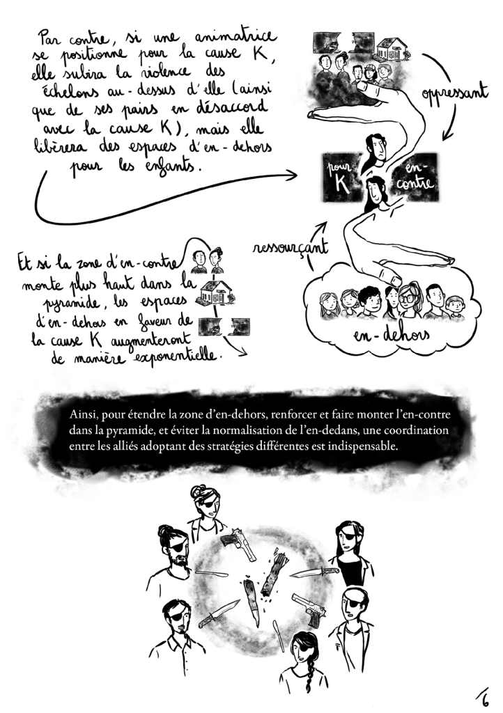 – L’en-dehors permet la création et la survie d’alternatives. Ces initiatives fabriquent de nouvelles normes qui peuvent pousser le système à se réformer pour le prendre en compte. Aussi, elles permettent aux opprimés de vivre des expériences dans un cadre le plus sécurisant possible, car diminuant la source de leurs oppressions. Par contre, les initiatives de l’en-dehors rassemblent la plupart du temps un public assez restreint. Et malgré le peu de confrontations directes aux systèmes oppressifs, les contraintes de ceux-ci finissent par agir sur les en-dehors de manière invisible. En effet, les espaces de l’en-dehors sont tolérés par le « système oppressif » lui-même : ils subissent donc aussi ses normes, mais de manière moins directe.