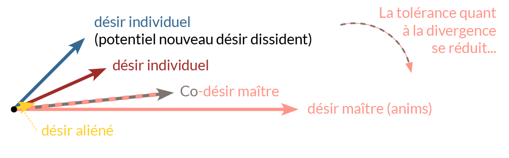 Par conséquent, au plus l’angle alpha (α) est élevé, au plus la tension entre les tenants du cadre (imposant le désir maître) et l’individue s’élevera également. Aussi, un désir individuel très élevé peut se mettre en concurrence avec le désir maître.