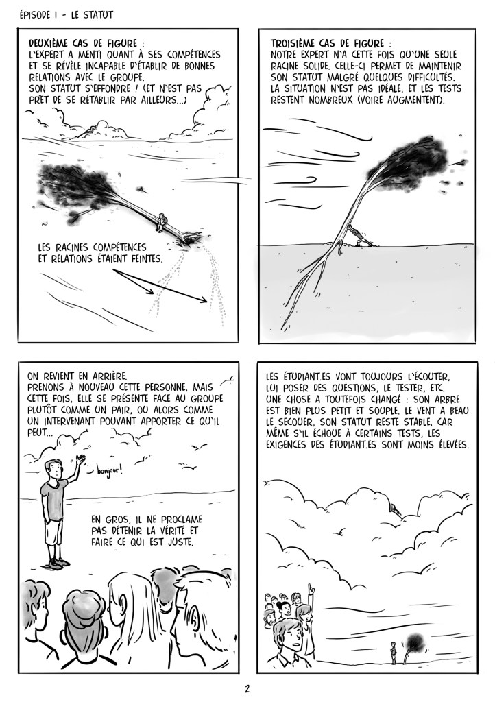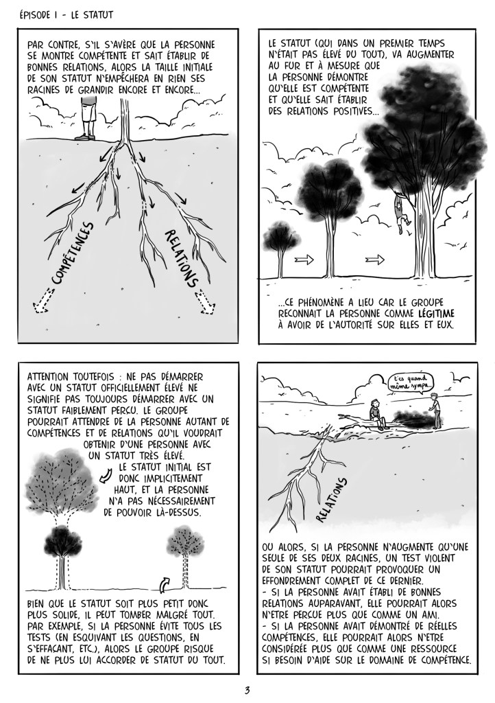 → L’une d’entre elles est la destruction totale du cadre. En effet, le cadre se maintient ici par un statut très élevé risquant de s’écrouler au moindre test. Même dans le cas d’une animatrice ayant des racines de compétences et de relation très profondes, elle devra systématiquement monter son statut trop haut, car ce type de cadre se fonde sur la dissuasion. Il doit réussir à faire croire que les garants du cadre sont capables de tout savoir, d’intervenir sur tout et de pouvoir faire ce qu’ils veulent : il est donc impossible d’avoir des racines assez grandes pour maintenir ce statut. Lorsque la supercherie ne tient plus, l’autorité de statut s’effondre et le cadre avec, risquant par ailleurs de se transformer en tyrannie d’absence de structure. Froncer les sourcils très forts peut certes élever le statut, mais attention lorsque l’on découvrira qu’aucun laser ne peut sortir de vos yeux en colère !