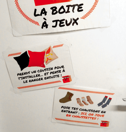 Lorsqu’un aménagement nécessite de comprendre des règles ou consignes spécifiques afin qu’il soit utilisé correctement, veillez à ce qu’elles soient visibles et facilement compréhensibles par tout le monde (une animatrice ou une enfant entrant pour la première fois dans l’aménagement). Cela vous aidera à sanctionner adéquatement. Souvent, une découverte des espaces avec les enfants est très utile pour appréhender les différents fonctionnements qu’ils supposent.