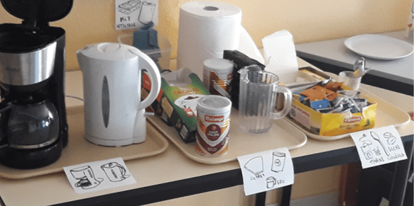 - Pour les étagères et tiroirs, de petites affiches à côté ou devant le matériel sont nécessaires (privilégiez les dessins lorsque c’est possible). Vous pouvez également fixer la photo de l’intérieur du tiroir si c’est facile de repérer le matériel.