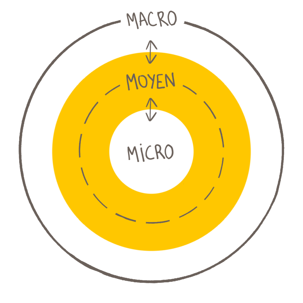 Vous trouverez ci-dessous des démarches pratiques — non exhaustives — concernant chaque échelle d’aménagements des plus simples aux plus complexes… Cependant, il faut garder en tête qu’on travaille dans le sens inverse sur le terrain. Néanmoins, il vaut peut-être mieux approfondir ce qui est simple dans un premier temps, tout en s’initiant à ce qui l’est moins. La plupart du temps, les directrices se chargeront des macroaménagements et les animatrices ne devront réfléchir qu’aux micros et moyens-aménagements. Pour ces raisons, les macroaménagements ne seront abordés que brièvement.
