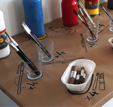 - Sur les tables, fixez un papier kraft ou une nappe en papier à défaut. Disposez le matériel sur le papier et tracez le contour de ce que vous posez (ciseaux, agrafeuse…). Tracez le contour des boîtes dans lesquelles se trouve du matériel et écrivez le nombre disponible (boîte de 8 crayons, bocal de 20 pinceaux…). De cette manière, un inventaire visuel du matériel est fait et facilite le rangement.