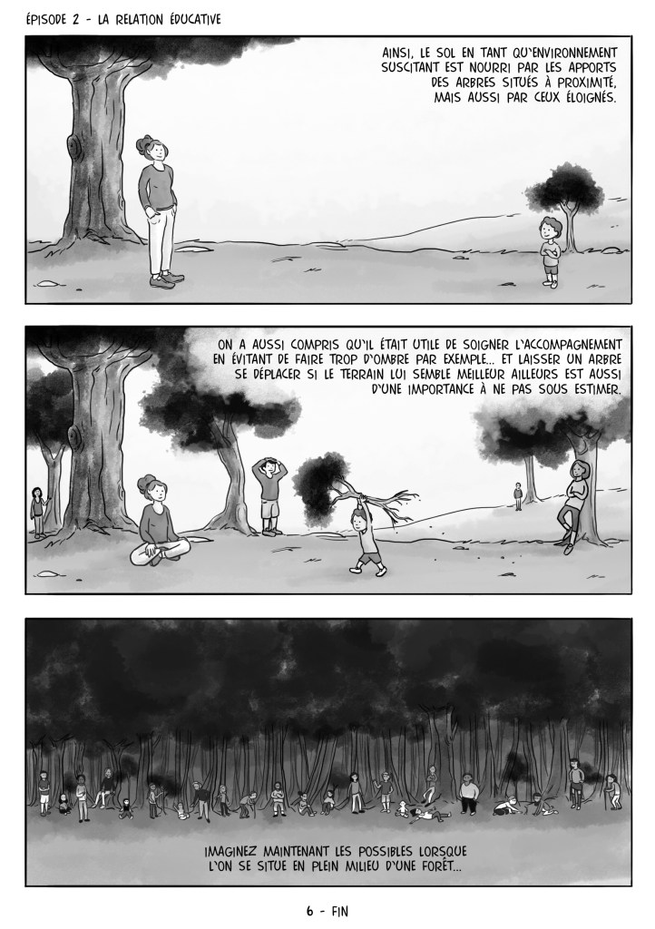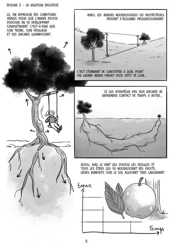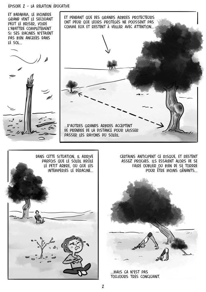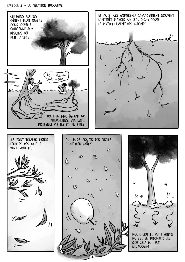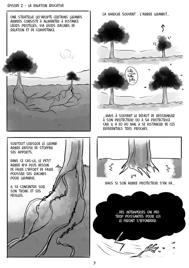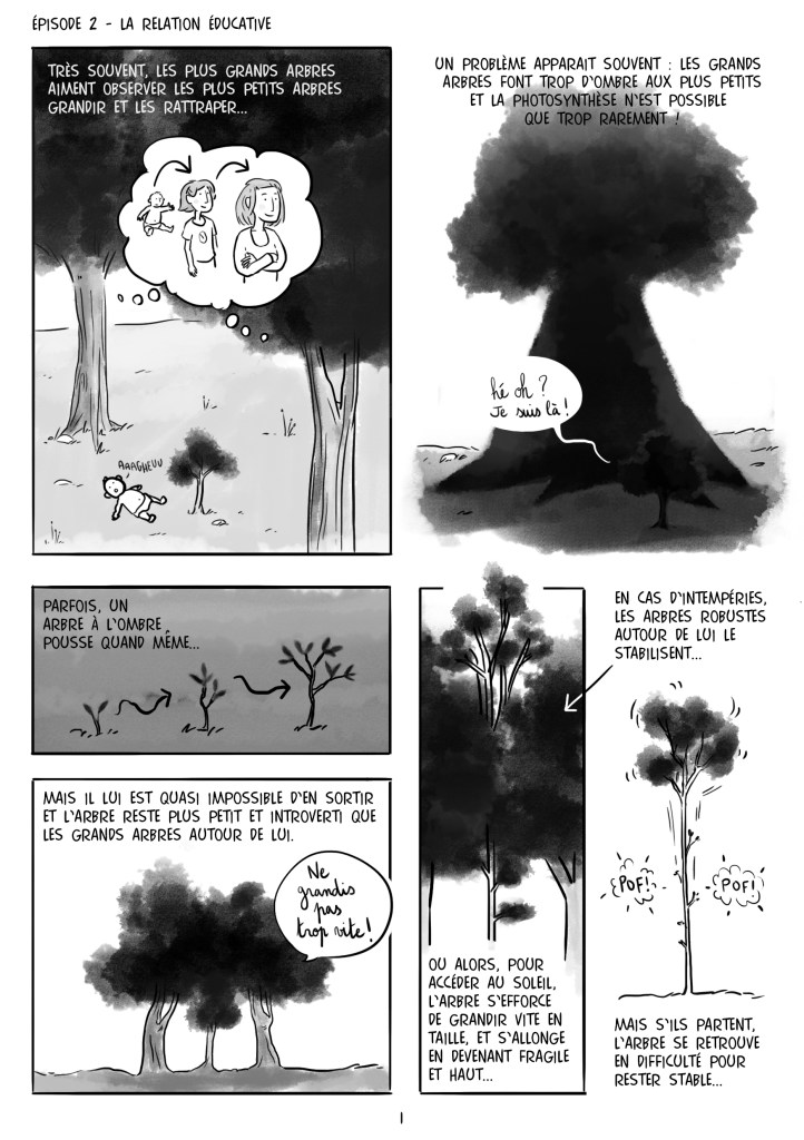 Avec ces arbres et à travers leurs interactions, nous souhaitons donner des outils théoriques illustrés afin que vous puissiez mieux déceler des abus d’autorité, des syndromes de l’imposteur*, etc. Aussi, nous espérons que cette bande dessinée vous aidera à comprendre la nature de certains rapports humains : peut-être vous aidera-t-elle à participer plus adéquatement à l’élaboration de rapports interindividuels justes ?
