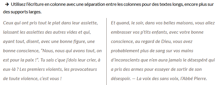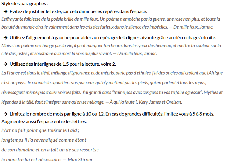 Lorsque vous travaillez un texte, il existe des sortes de consensus sur la manière de le mettre en page. On justifie son texte[1] quand on veut que ça fasse propre, on aligne très rarement à droite[2], car pour le lecteur ou la lectrice occidental·e, l’impression est étrange, on a tendance à centrer le titre principal, etc.