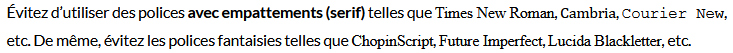 Enfin, il en est de même pour l’écriture. Les typographies complexes sont très difficiles à réaliser : ainsi, privilégiez des lettres minimalistes sans empattement[31] (caractères à bâtons) pour leur lisibilité et leur accessibilité.