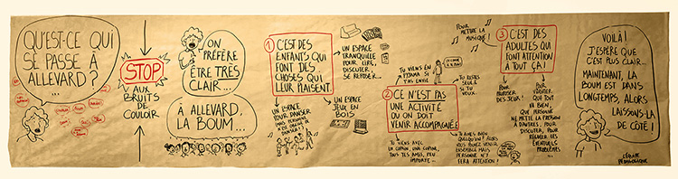 Par exemple, « Il y a beaucoup de textes sur cette affiche, et je constate que deux typographies ont été choisies : une pour distinguer les informations capitales, l’autre pour les informations détaillées. La couleur change aussi. C’est une bonne idée aussi cette disposition, je crois que ça marcherait bien pour l’affiche qui expliquera le fonctionnement de la ludothèque. »