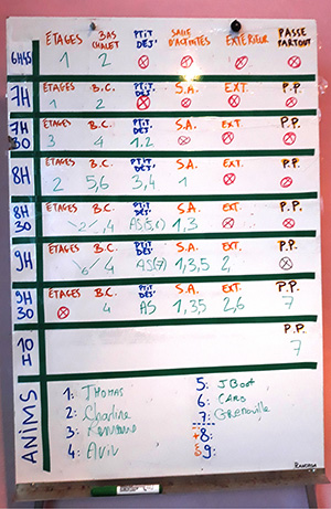 Comme le dessin, la photographie est un puissant moyen de montrer quelque chose à un·e spectateur·rice. Son usage peut être très judicieux lorsque vous avez très peu de capacités graphiques, que vous n’avez pas le temps de dessiner une série d’éléments, ou qu’importe votre raison. Par exemple, admettons que vous aménagiez un vestiaire pour le retour du ski dans un centre de vacances. Ainsi, vous souhaitez indiquer à quels endroits doivent être mis les différents types de matériel (les casques de ski pendus ici, les vestes accrochées là, les chaussures sur le séchoir là-bas, les gants plutôt là, etc.). Photographier indépendamment chaque élément pour les imprimer, les plastifier et les afficher peut être un moyen très fonctionnel pour parvenir à vos fins : au-dessus des fils dédiés aux casques, on verra ainsi un casque pendu par sa bride, et on comprend immédiatement ce qui est attendu sans qu’on ait besoin de rajouter du texte explicatif. Ou encore, il est très efficace de prendre en photo une table de matériel pour montrer la manière dont elle se range[52].