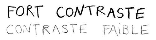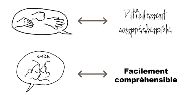 1. Une affiche à l’écriture épaisse et en capitales noires sera lisible à la fois pour des personnes ne voyant pas très bien de loin, et à la fois pour celles n’ayant pas l’habitude de lire une écriture manuscrite. Elle reste évidemment lisible pour presque tou·te·s les autres lecteur·rice·s, et ce type de code n’est pas redondant. Seules les personnes ayant des troubles cognitifs spécifiques (troubles DYS) pourraient être en difficulté avec l’écriture toute en majuscule. Nous en parlerons juste après.